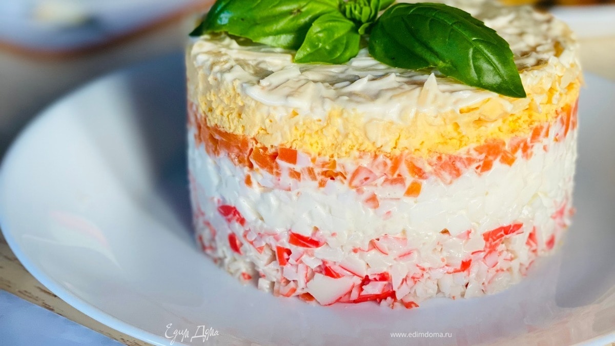 - Шаг 2Все ингредиенты мелко порубить ножом и выложить слоями в такой последовательности: крабовые палочки, яичные белки, морковь, яичные желтки, сыр. Каждый слой промазать майонезом.