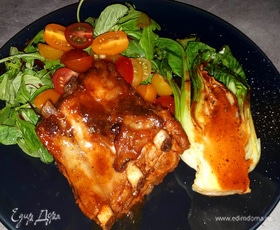 Для жарки в духовке выложите мясо на противень, смажьте маринадом и готовьте в духовке при 180°C полчаса. Затем посыпьте сахаром сверху, включите гриль и оставьте еще на 5–10 минут.