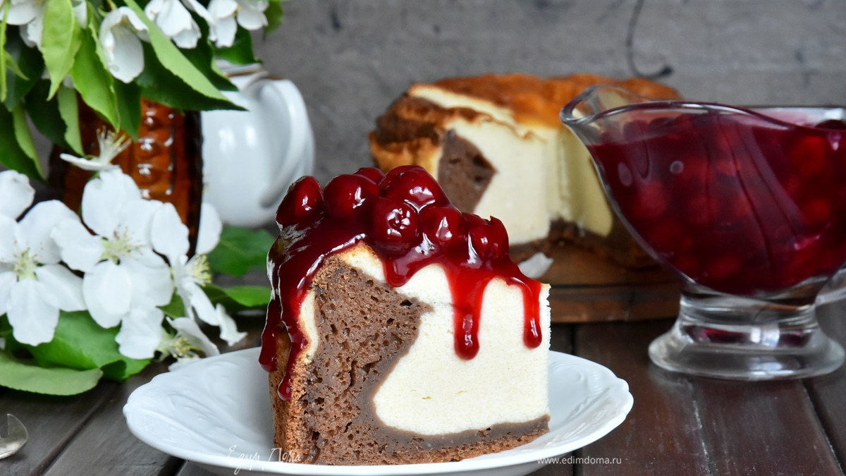 Летом обязательно подайте к шоколадной ватрушке ягодный соус. Идеально подойдет вишня. Для соуса проварите 200 граммов ягод с небольшим количеством сахара. Для густой консистенции ягодного соуса добавьте 1 ст. л. крахмала, размешанного в 0,5 стакана воды.