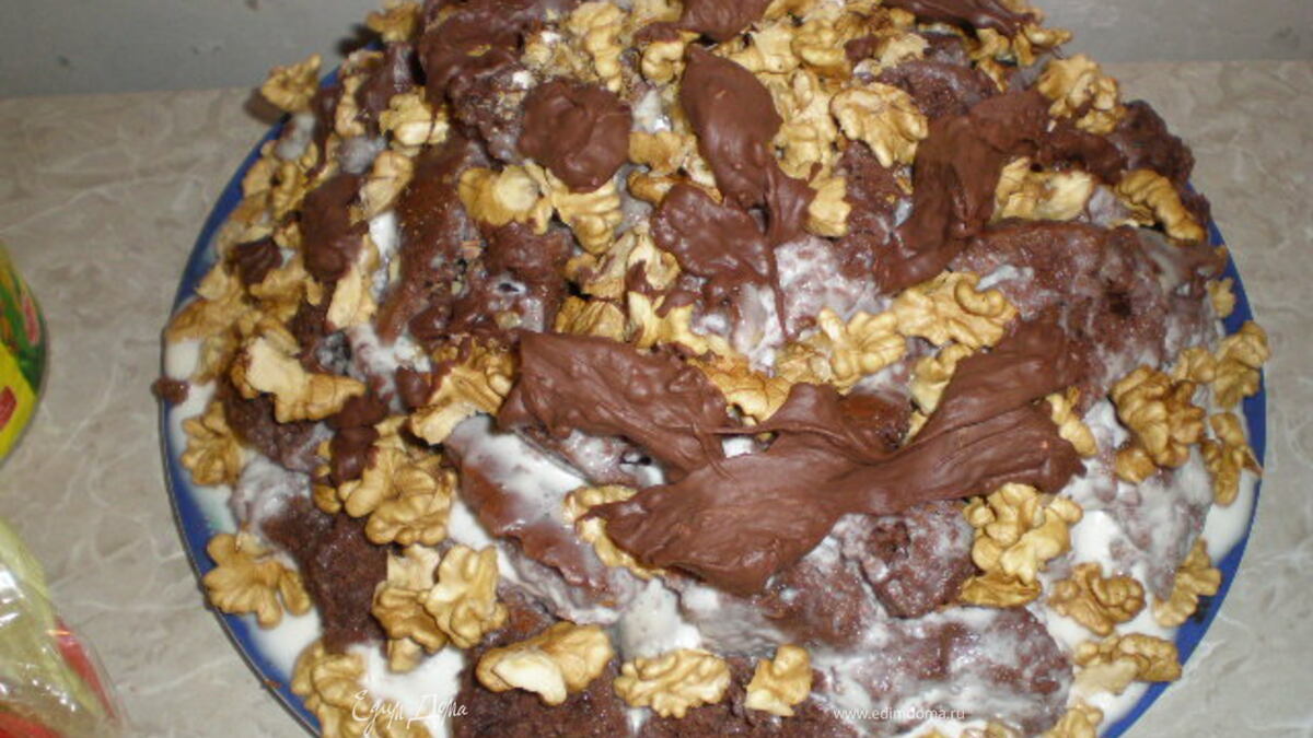 - Шаг 1яйца взбить с сахаром в хорошую пену, добавить сгущенку, сметану, соду погашеную уксусом, муку. Меньшую половину вылить в противень для запекания, а во вторую половину(большую добавить какао и перемешать).Выпечь вторую половину. Когда коржи остынут, белый корж промазать сметанным кремом, а второй ламать средними кусками и макать в сметанный крем и вылаживать горкой на белый. Сверху торт засыпать орехами и полить молочным шоколадом. Дать настоятся.