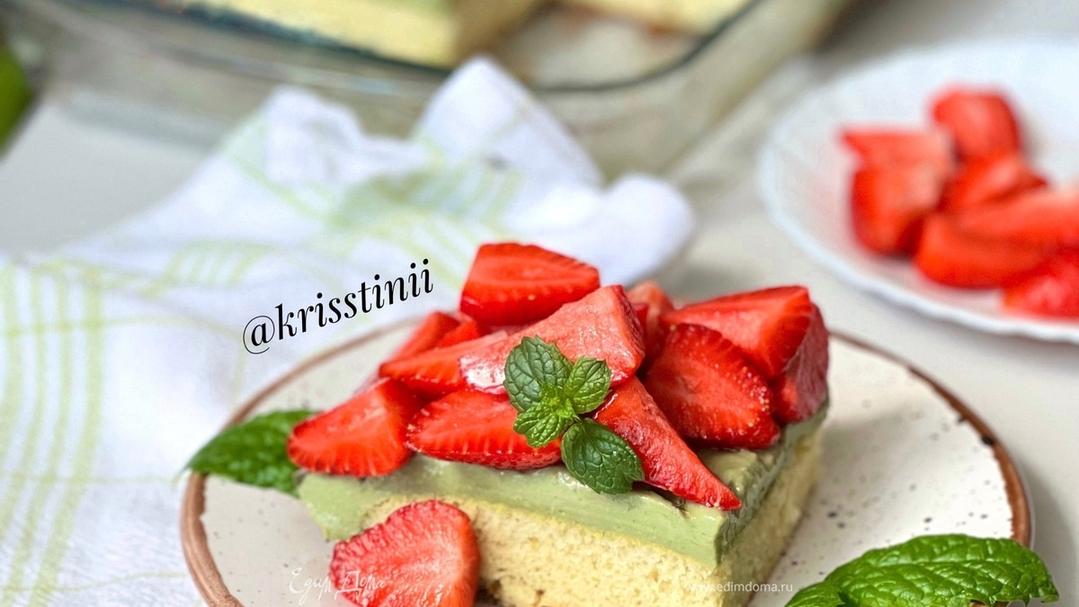 На готовый корж выложите весь крем и аккуратно его разровняйте. Оставьте заготовку на несколько часов (либо на ночь). После чего нарежьте на порционные пирожные и украсьте клубникой или другими ягодами по вкусу.