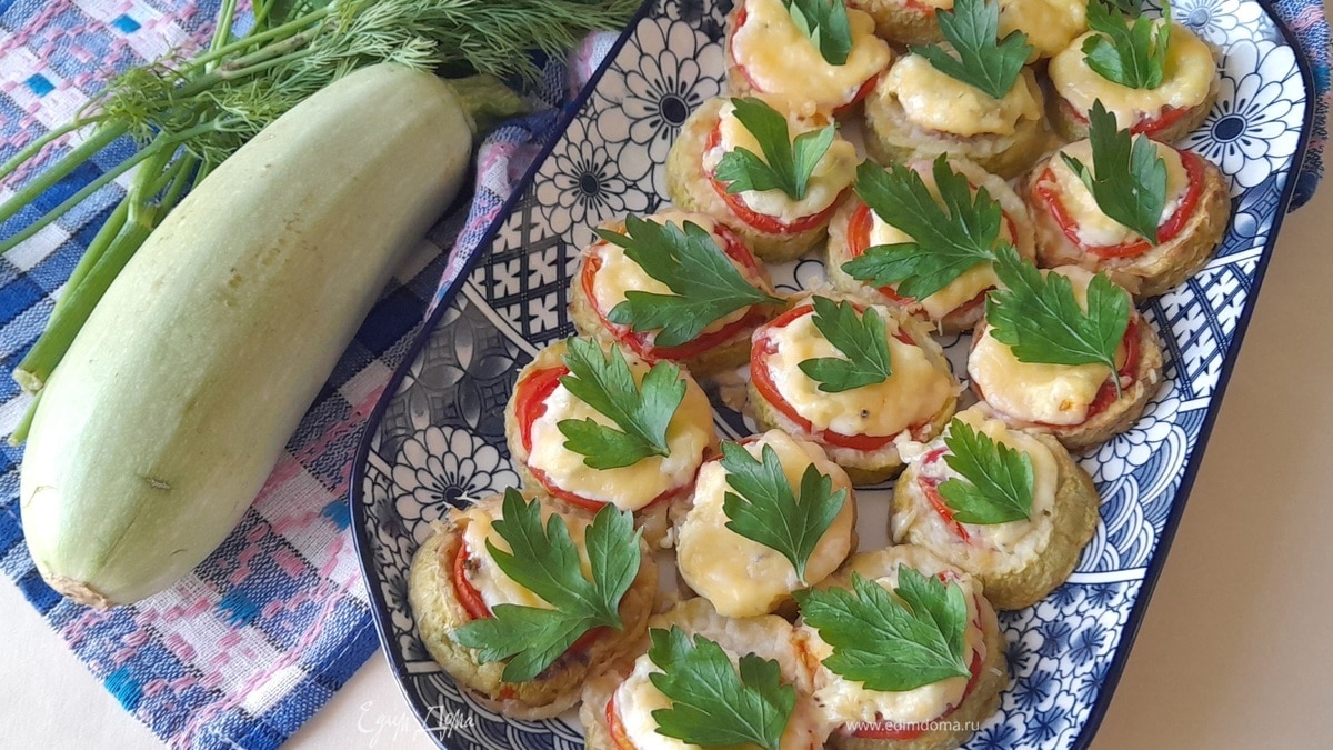 Запеченные кабачки с помидорами выложить на блюдо. Украсить листиками петрушки и подать к столу. Вкусно и в теплом, и в холодном виде. Угощайтесь! Приятного аппетита!