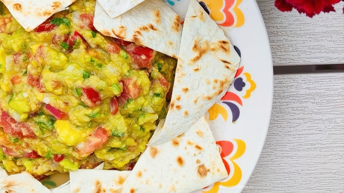 - Шаг 2Лаваш нарезать на треугольники и обжарить на сухой сковороде по 1–2 минуты с каждой стороны. Гуакамоле выложить на тарелку и рядом выложить чипсы из лаваша. Можно их подавать отдельно. Приятного аппетита!