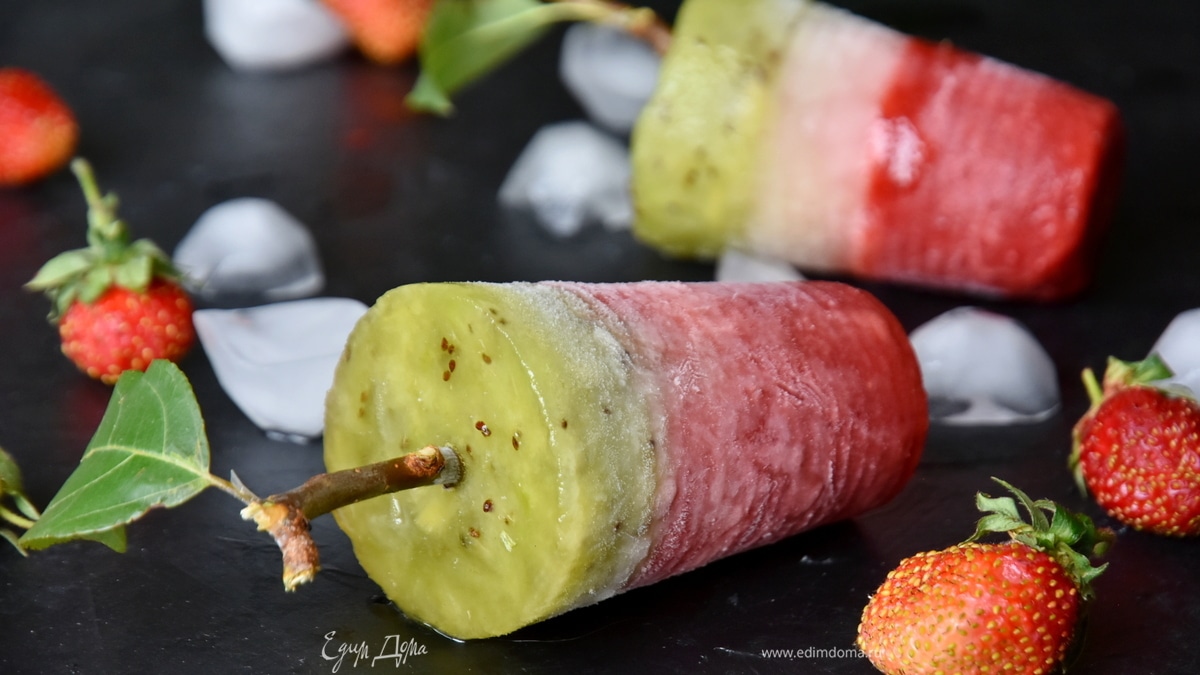 Последним слоем добавить пюре из киви. В середину формы установить палочки и отправить фруктовый лед в морозильную камеру до полного замораживания. При извлечении фруктового льда из форм достаточно опустить их на несколько секунд в теплую воду.