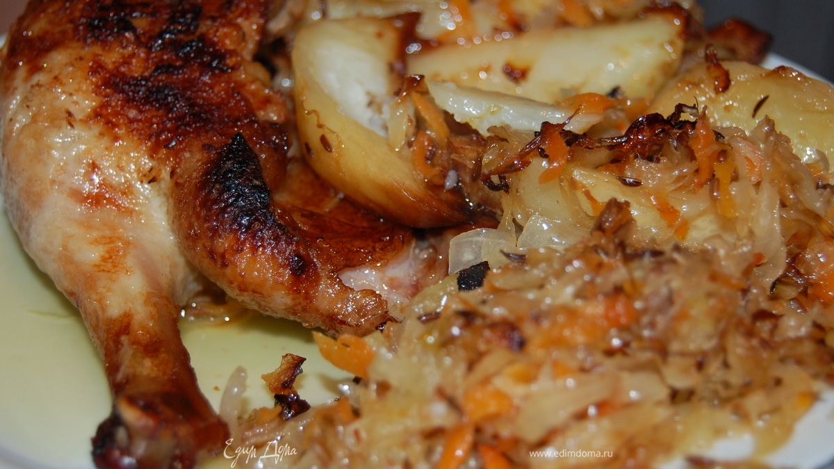 Картофель чистим и режем на свое усмотрение, мой муж любит, чтобы мелко было порезано, режем яблоки и удаляем сердцевину, утку солим и перчим с двух сторон. Укладываем в форму (или на противень) наши ингредиенты. Капуста в процессе очень сильно уменьшается в объеме, так что не стесняемся, кладем побольше. Отправляем все в разогретую до 220 градусов духовку и забываем о нашей утке на час минимум, а лучше на полтора. Один раз стоит подойти и утку перевернуть, чтоб с обеих сторон подрумянилось. Приятного аппетита!