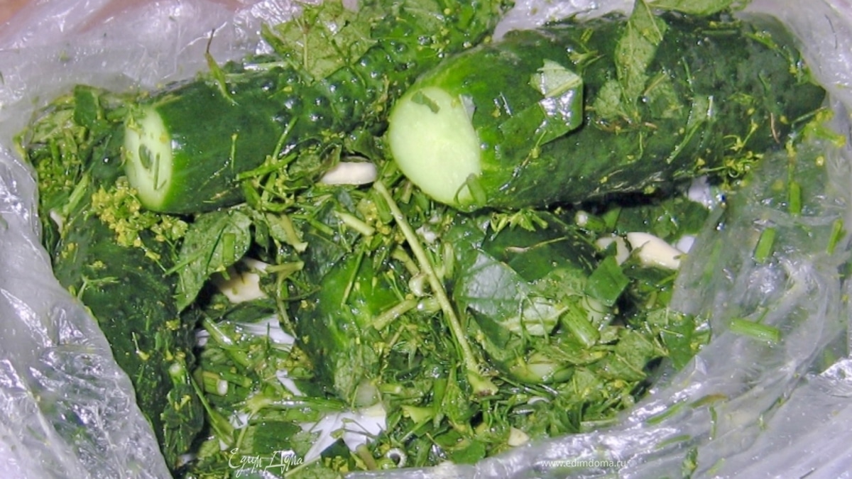 Все сложил в пакет, потряс, в смысле перетряхнул, чтобы содержимое равномерно распределилось. Все, что в пакет было сложено, должно быть в идеале совершенно свежим! Только тогда будет достигнута цель! Огурцы получаются изумительного свежемалосольного вкуса. Никакой жидкости. Все само собой появится. Эти огурчики будут готовы через 1,5–2 часа. Хрустят 2–3 дня, если доживут, но это вряд ли. - Шаг 4