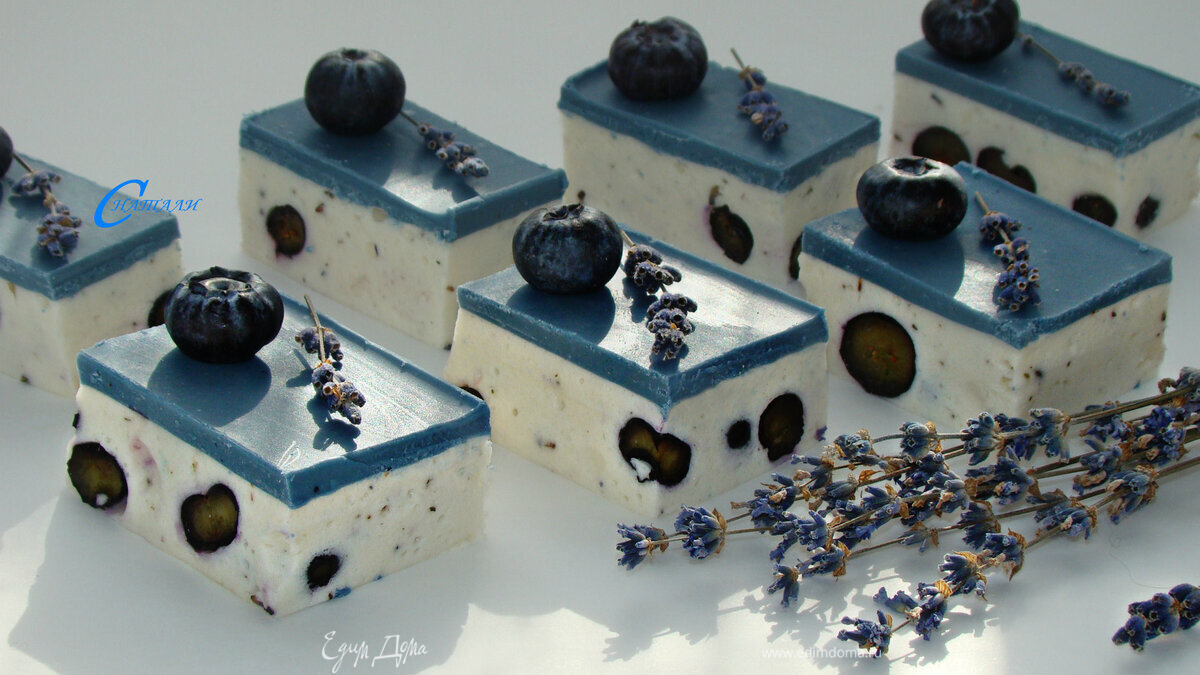 В массу добавьте ягоды черники или голубики и чайную ложку сухой лаванды, аккуратно перемешать лопаткой (цветы лаванды при желании можно измельчить).