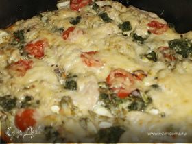 Нежная рыбка внутри под обилием овощей, и все покрыто ароматной заливкой. Форма керамическая от «Едим Дома»: 30 см на 23 см, высота — 6 см.