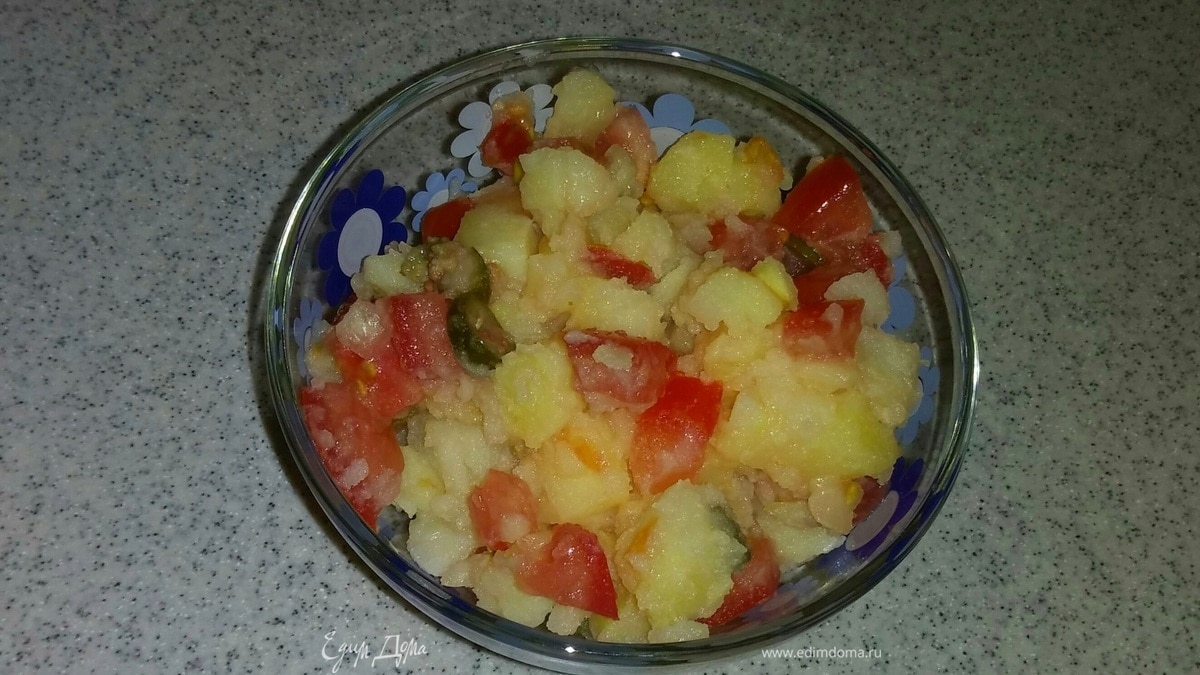 Отварной картофель, помидор и репчатый лук нарезать мелкими кубиками и положить их в глубокую емкость. - Шаг 2