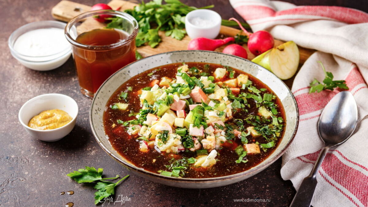 Вкусная окрошка с хрустящими кубиками сезонных овощей и пикантной заправкой из горчицы и сметаны — одно из самых любимых летних блюд. В качестве мясной составляющей в этот холодный суп можно положить практически все: докторскую колбасу, отварной язык, буженину, курицу или индейку. Мы предлагаем самый простой вариант — сосиски! Наверняка они найдутся в холодильнике у любой хозяйки. Также советуем добавить в окрошку с сосисками яблоко, оно придаст холодному супу свежесть и легкую кислинку.