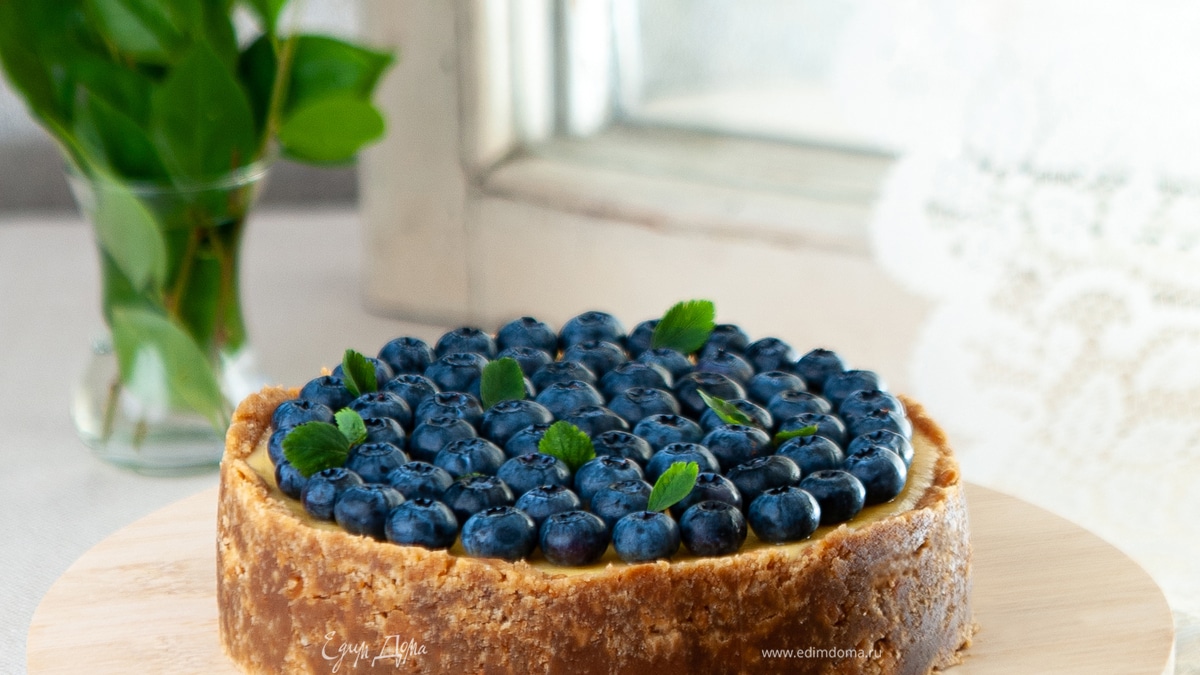 Выложить смесь на песочную основу. В духовку поставить емкость в водой. Это позволит увлажнить воздух, и чизкейк равномернее пропечется. Выпекать при 130°C 1,5–2 часа. Дать остыть, украсить ягодами.
