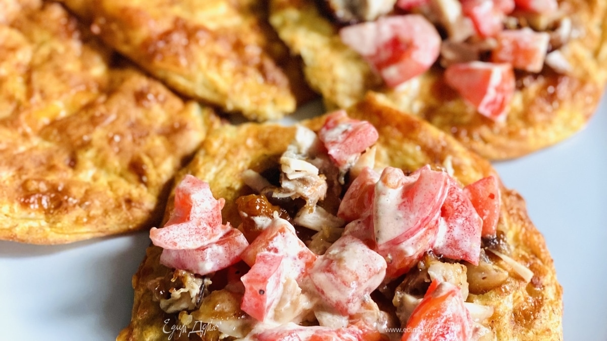 - Шаг 2На силиконовом пергаменте сформировать лепешки диаметром 10 см и отправить в духовку, разогретую до 200°C, на 20–30 минут. Подавать с любой начинкой. Например, куриное мясо и помидор с майонезом.