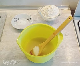 Опара: в теплую воду добавляем дрожжи и сахар, перемешиваем до растворения.