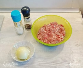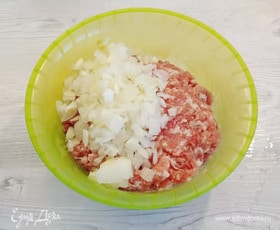 В фарш мелко нарежем лук, добавим специи и воду, тщательно перемешиваем.