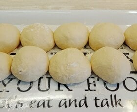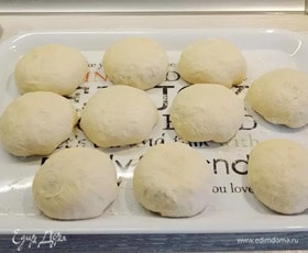 После того как тесто поднялось, делим его на 10 равных частей, около 60 г каждый колобок, и даем отдохнуть 7 минут.