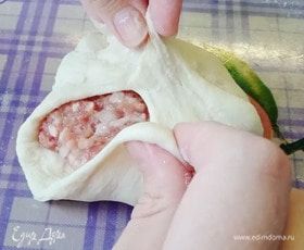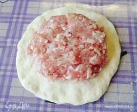 Каждый шарик раскатываем в лепешку, в середину кладем фарш.