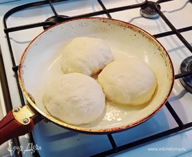 Начинаем жарить беляши узелком вниз на разогретой сковороде с маслом. Готовим на небольшом огне под крышкой 4 минуты с каждой стороны, ориентируемся на свою плиту.