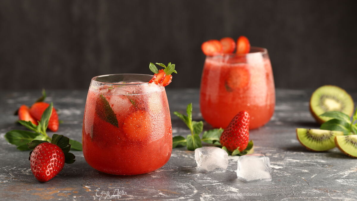 Например, советуем приготовить освежающий напиток на основе клубничного сока с добавлением минеральной воды, киви, мяты и кубиков льда.
