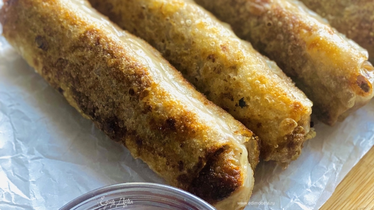 - Шаг 6Рулетики обжарить на растительном масле на среднем огне со всех сторон до готовности. Переложить на бумажную салфетку для впитывания лишнего масла. Затем подавать.