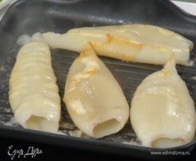 Смазать сковороду-гриль оливковым маслом и обжарить кальмаров до готовности с двух сторон.