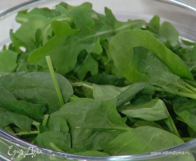 Помидоры разрезать вдоль на 4 части и, удалив ложкой мякоть с семечками, выложить на шпинат и руколу.