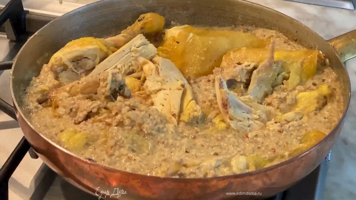 Продолжая помешивать, прогревать, пока масса не загустеет, затем всыпать измельченные орехи со специями и влить столько бульона, чтобы получился густой соус, все посолить.