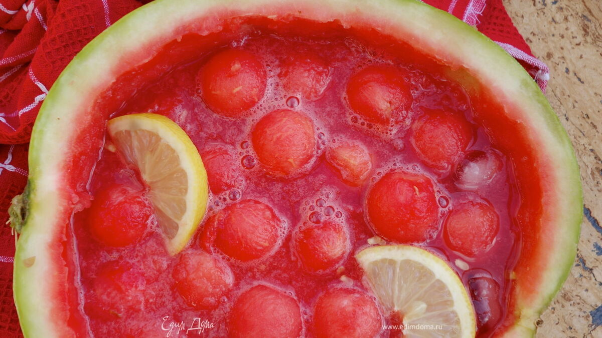 - Шаг 4Классический рецепт можно изменить, заменив коньяк на ром, а шампанское — на газированную воду. Алкогольный крюшон в арбузе подают охлажденным и разливают по бокалам небольшим половником.