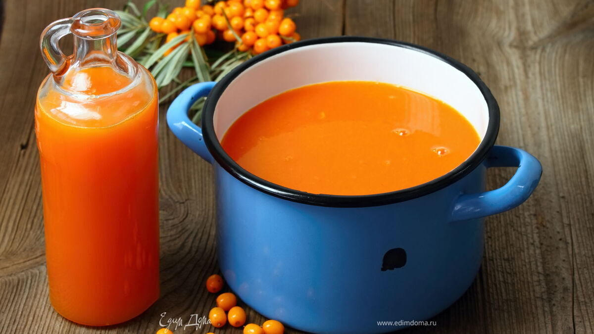 Ярко-оранжевую кислую облепиху тяжело есть в свежем виде. Лучше добавить полезную ягоду в чай или сварить красивое янтарное варенье. Также мы предлагаем заготовить из облепихи сок на зиму. На его основе можно готовить согревающие напитки с добавлением меда и специй. Витаминный нектар из облепихи зарядит энергией и снабдит организм витаминами в холодное время года. Существуют разные рецепты приготовления сока из облепихи, редакция «Едим Дома» советует не добавлять в заготовку много сахара, чтобы сохранить натуральный вкус облепихи и больше витаминов.