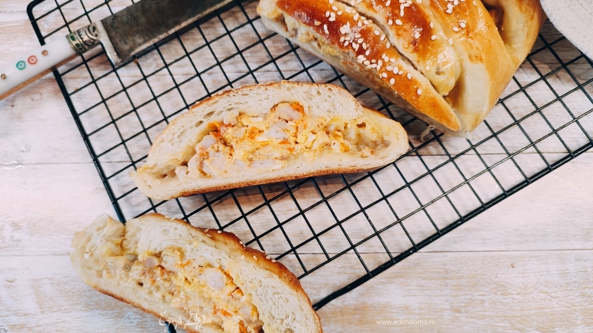 Закрыть начинку, разрезать в виде косички. Оставить пирог на 20 минут, чтобы подошел. Смазать яичным желтком, можно посыпать кунжутов. Выпекать 30 минут при температуре 200°C. - Шаг 5