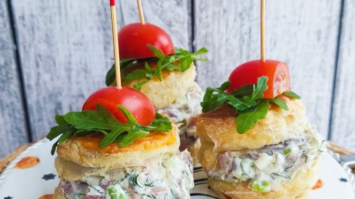 Кружки смазала желтком и отправила в духовку буквально на 5–10 минут при температуре 180°C. - Шаг 4Разрезала пополам профитроли, положила начинку и украсила руколой и черри.