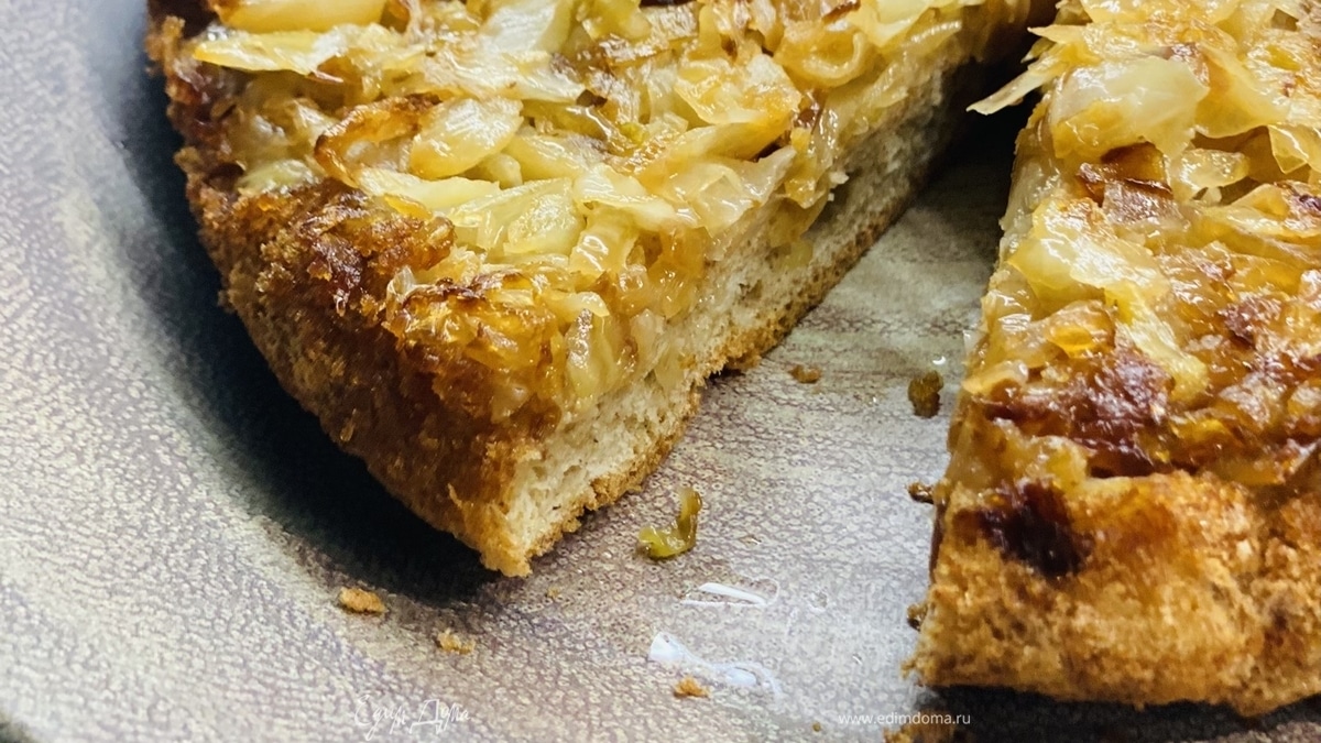 - Шаг 4На дно силиконовой формы (16 см) выложить капустную начинку, залить тестом и отправить на 25 минут в духовку, разогретую до 200°C. По готовности достать и перевернуть при помощи тарелки капустой вверх.
