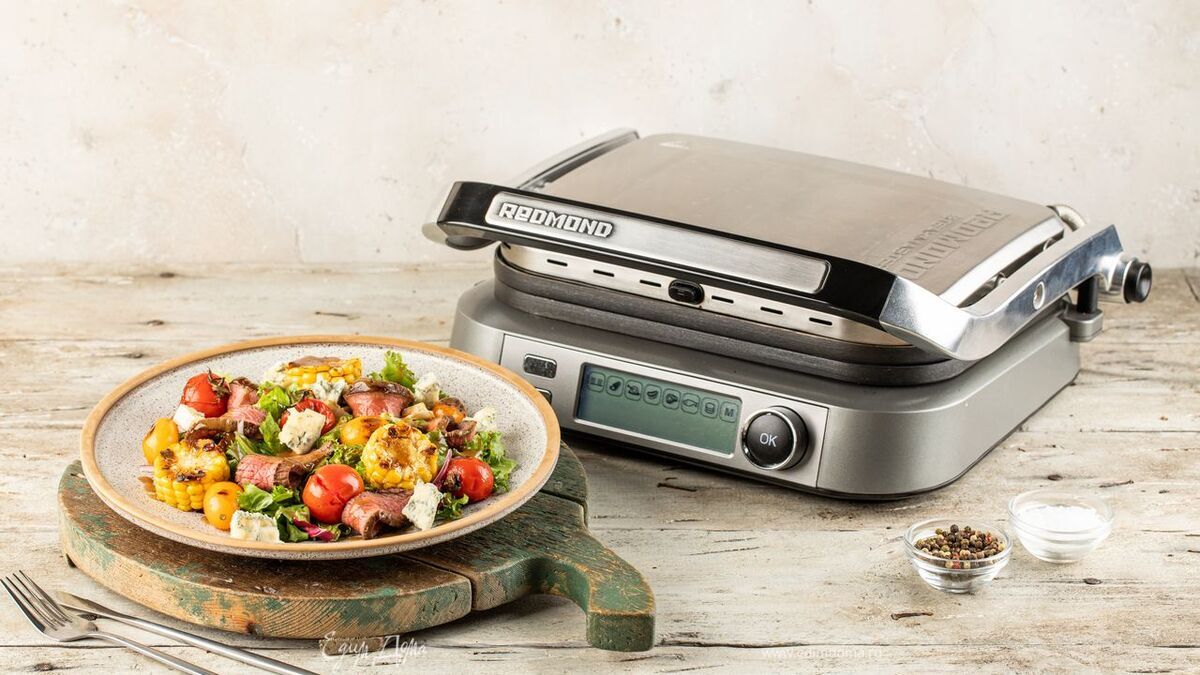 На гриль-духовке SteakMaster REDMOND RGM-M816P выберите программу «Мясо», дождитесь звукового сигнала и выложите говядину. Гриль-духовка автоматически установит время приготовления, исходя из толщины стейка. На специальном индикаторе можете проследить за степенью прожарки — rare, medium или well done. - Шаг 3