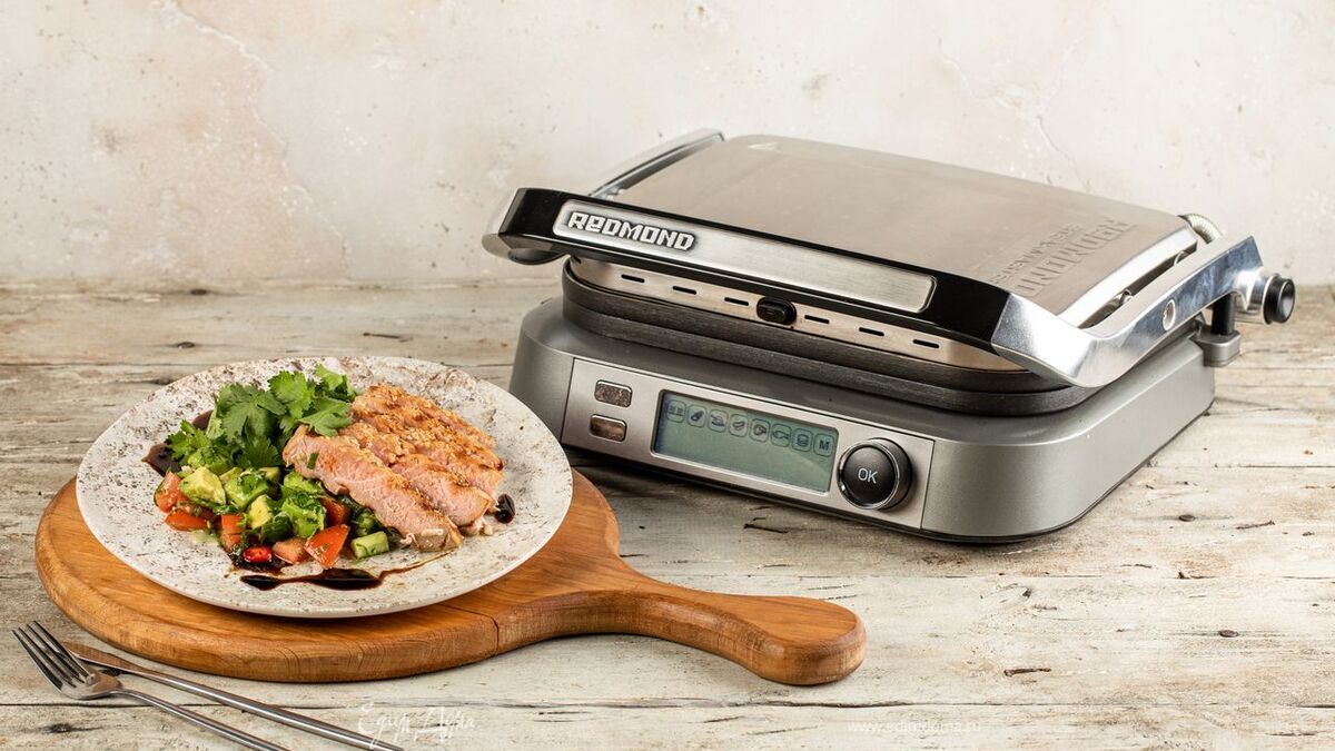 Обваляйте тунца в семенах кунжута. На гриль-духовке SteakMaster REDMOND RGM-M816P установите программу «Рыба», дождитесь звукового сигнала и выложите тунца. Гриль-духовка автоматически установит время приготовления, исходя из толщины кусочков. - Шаг 8