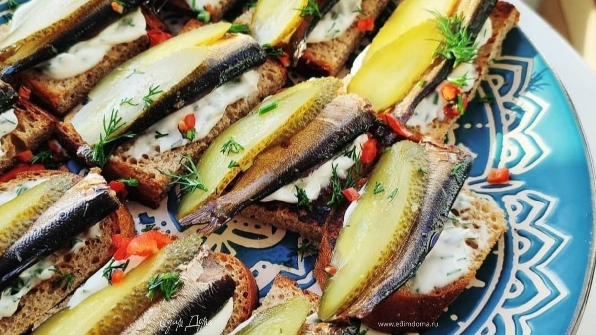 - Шаг 3Хлеб намажьте соусом, выложите шпроты и тонко нарезанный огурец.