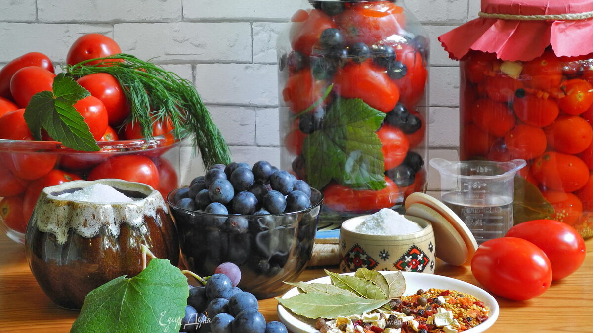 Маринованные помидоры с виноградом «изабелла» на зиму