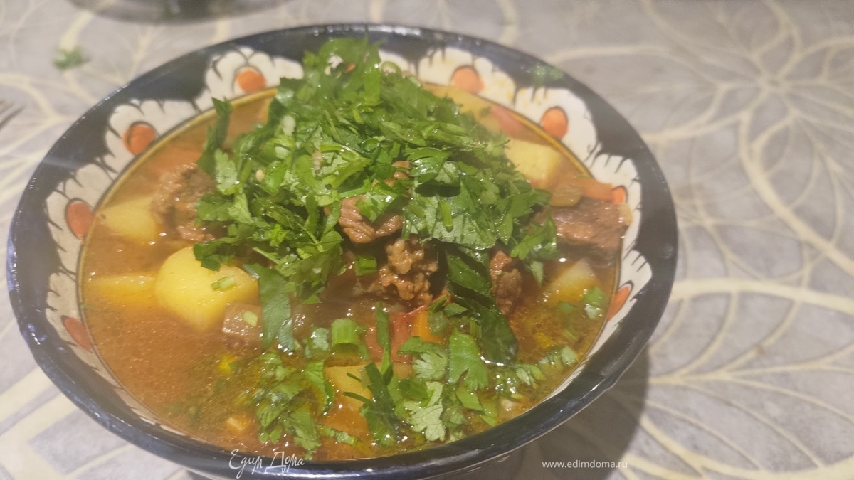 Выложить лапшу в тарелки. Сверху залить лагманом, добавить зелень. Приятного аппетита!