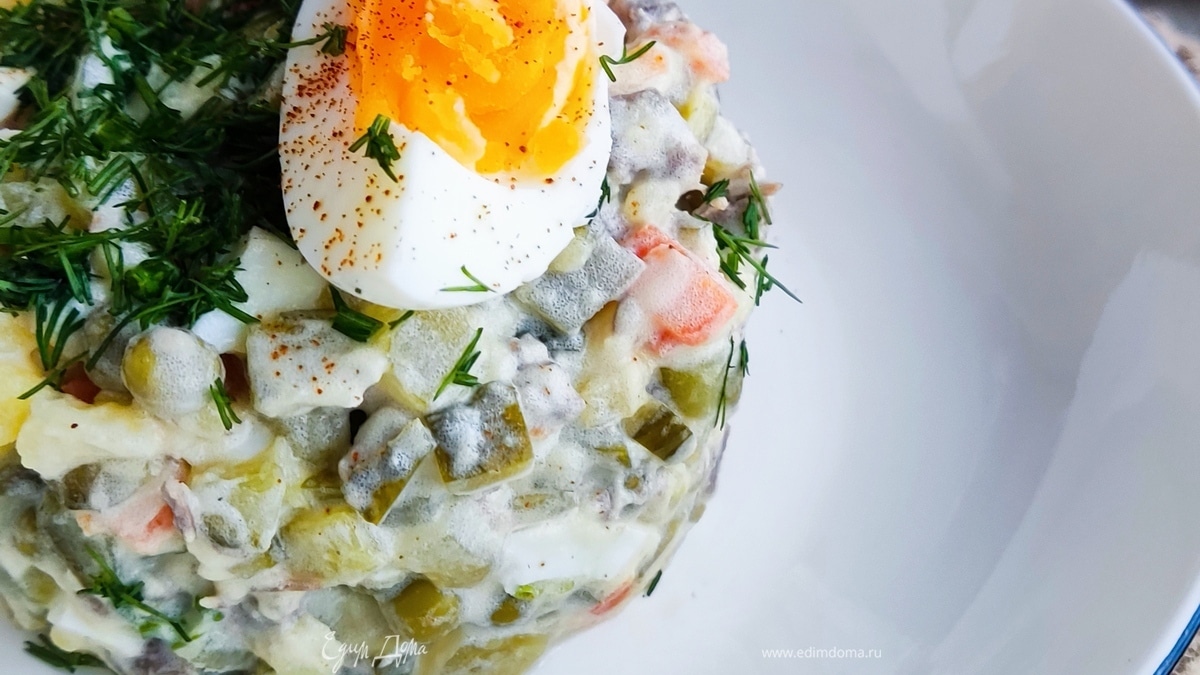 - Шаг 1Мякоть говядины и овощи отварить. Овощи очистить от кожуры. Все нарезать мелким кубиком, посолить. Добавить майонез, горошек и перемешать. Выложить салат в сервировочное кольцо.