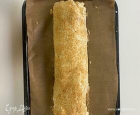 Сформировать рулет, переложить на смазанный маслом противень или на бумагу для выпечки швом вниз. Верх смазать сметаной (можно майонезом), посыпать панировочными сухарями, сбрызнуть растопленным сливочным маслом, проколоть в 2–3 местах, чтобы не было трещин при выпечке. Выпекать минут 15 при температуре 160°C, до золотистой корочки.