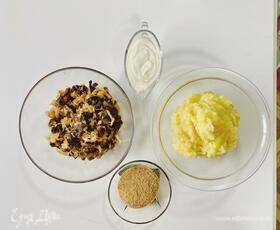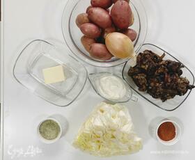 Подготовить ингредиенты: 1 кг картофеля, 50 г сливочного масла, репчатый лук, 0,5 кг грибов, 0,5 кг капусты (свежей или квашеной) или любые овощи по вкусу, 3 ст. ложки сметаны, 200 г панировочных сухарей.