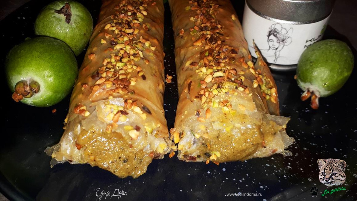 Смажьте лист фило растопленным маслом и посыпьте фисташками. Затем накройте следующим листом, смажьте маслом и так по очереди. - Шаг 4