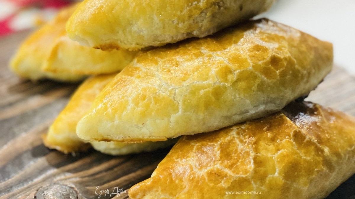 - Шаг 2Тесто разморозить до состояния альденте, вырезать из него кружки. Немного раскатать каждый на припыленном мукой столе, разложить начинку и сформировать пирожки.