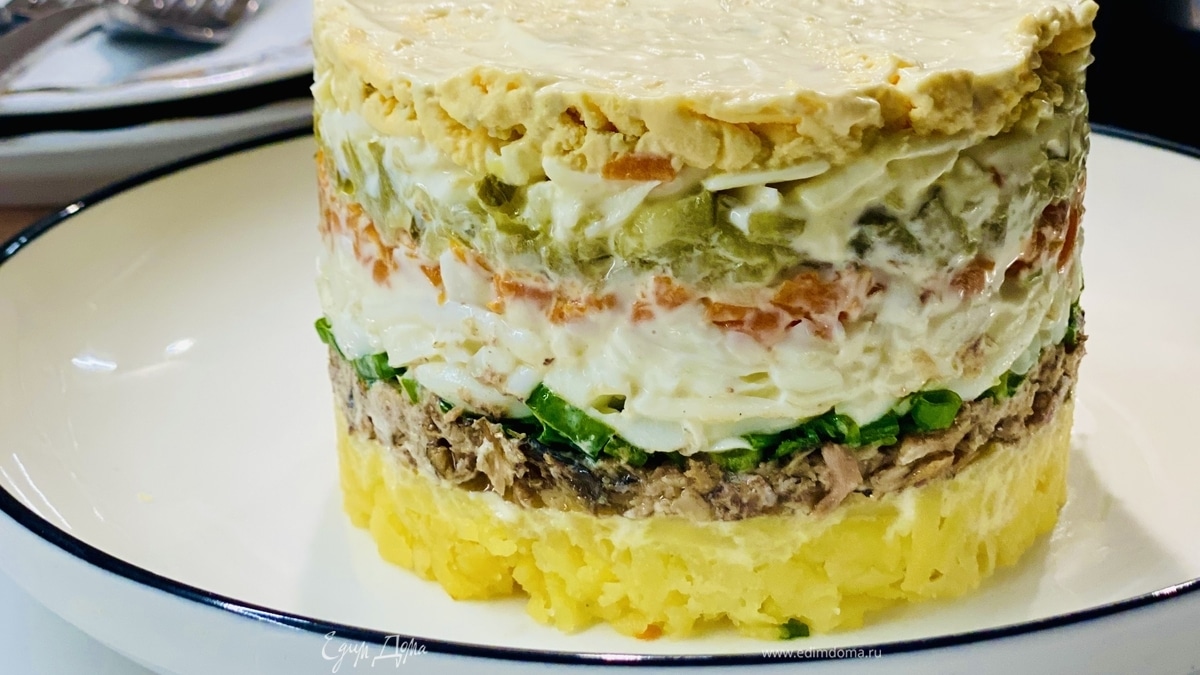 - Шаг 2Выложить слои, начиная с картофельного, в любой последовательности, смазывая каждый слой майонезом.