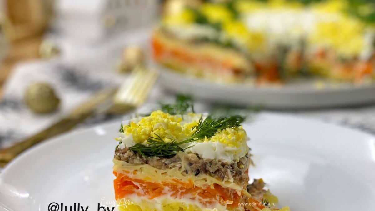 - Шаг 2Салат выкладываем в форму (у меня кондитерское кольцо, квадрат) слоями: картофель, смазываем майонезом; морковь, смазываем майонезом; сыр; сардины, смазываем майонезом; мелко рубленый укроп; 1/2 желтка; белок, смазываем майонезом.