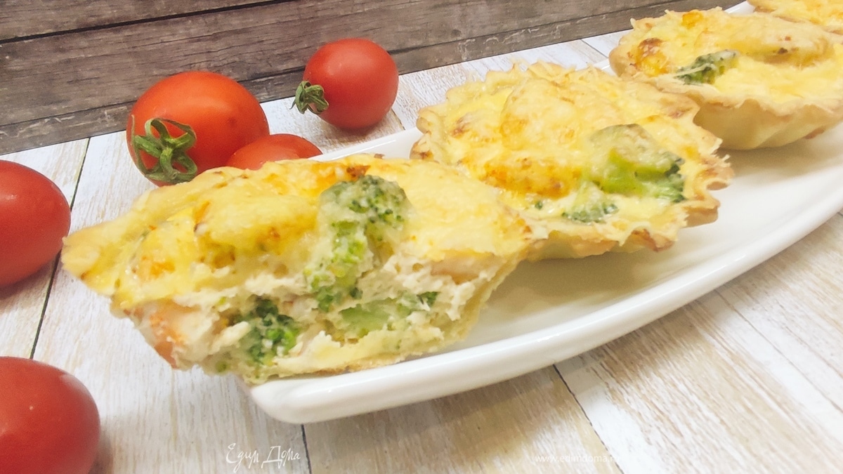Для начинки размороженные креветки нарезать на несколько частей. Несколько штук можно оставить, чтобы положить сверху. Брокколи отварить в течение 5 минут, охладить и разделить на маленькие соцветия. Охлажденные тесто раскатать и выложить в формочки. Наколоть вилкой, накрыть бумагой, положить груз и выпекать 15 минут при температуре 180°C. Для заливки смешать яйцо и сливки. Посолить по вкусу. В тарталетки выложить креветки, брокколи, залить заливкой. Запекать еще 10 минут.