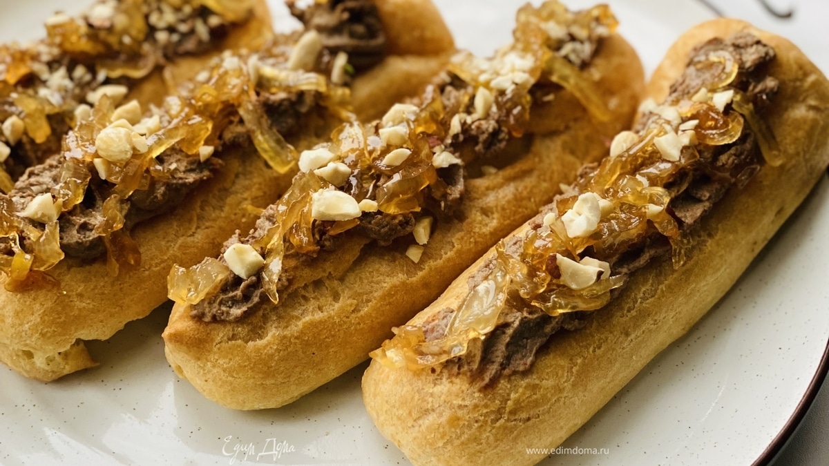 - Шаг 6В остывших эклерах сделать ножом проколы сверху, через которые наполнить полость паштетом. Сверху также распределить паштет, украсить карамелизированным луком и посыпать жареным фундуком.