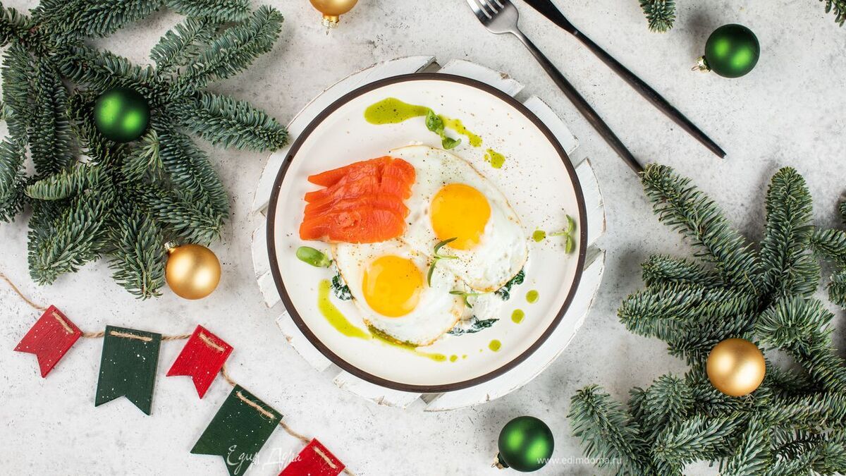 На тарелку выложите шпинат, на него — глазунью, а рядом положите кусочки слабосоленой рыбы.