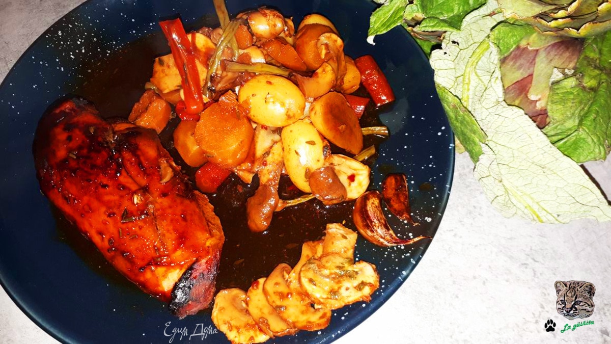Предлагаю вам рецепт тушеных овощей с куриными грудками и корочкой барбекю.