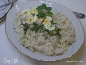 - Шаг 7Подавайте ароматный рис с сибасом и зеленью.