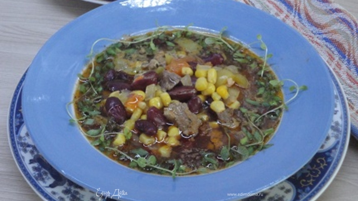 Выложить в суп фасоль и кукурузу, добавить острый красный перец по вкусу, попробовать на соль. Довести до кипения. Выключить нагрев и оставить на плите на 15 минут настояться. - Шаг 5