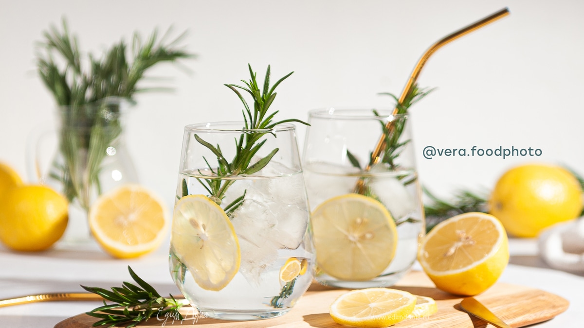 - Шаг 1Несколько веточек розмарина нарежьте на крупные кусочки, выдавите сок половины лимона и залейте литром воды.